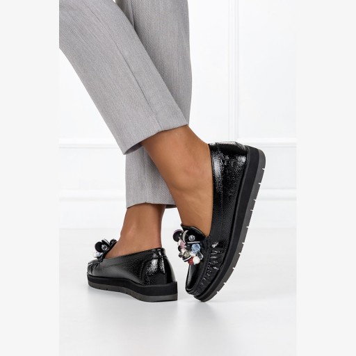 Czarne mokasyny damskie z ozdobą model D23WX4-BP zostały wykonane z wysokogatunkowej lakierowanej skóry ekologicznej co gwarantuje doskonałą jakość, wygodę i dopasowanie do stopy. Skórzana wkładka w butach to dodatek, który ma kluczowe znaczenie dla komfortu i higieny stóp. Mokasyny z ozdobą to niezwykle eleganckie obuwie, które stanowi połączenie wygody i luksusu. Te wyjątkowe buty zostały stworzone dla osób, które pragną wyróżnić się i dodać blasku swojemu stylowi. Ich charakterystyczną cechą jest efektowna ozdoba, która zdobi cholewkę, dodając mokasynom niezwykłego uroku i elegancji. Te wyjątkowe buty są idealne zarówno do codziennych, jak i bardziej formalnych okazji. Mogą być noszone z eleganckimi spodniami lub spódnicą, dodając całości szyku i elegancji. Są doskonałym wyborem dla tych, którzy chcą dodać odrobinę blasku do swojej casualowej garderoby. Mokasyny z dekoracją to obuwie, które przyciąga spojrzenia swoim wyjątkowym designem i błyszczącymi akcentami. Na Casu znajdziesz wiele wzorów, które z pewnością dodadzą oryginalności Twoim stylizacjom.