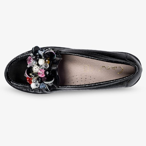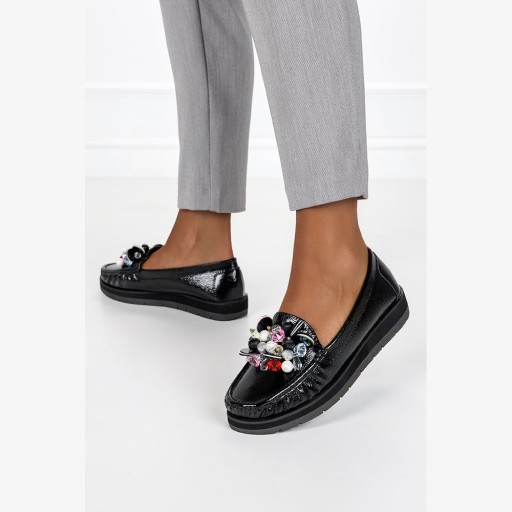 Czarne mokasyny damskie z ozdobą model D23WX4-BP zostały wykonane z wysokogatunkowej lakierowanej skóry ekologicznej co gwarantuje doskonałą jakość, wygodę i dopasowanie do stopy. Skórzana wkładka w butach to dodatek, który ma kluczowe znaczenie dla komfortu i higieny stóp. Mokasyny z ozdobą to niezwykle eleganckie obuwie, które stanowi połączenie wygody i luksusu. Te wyjątkowe buty zostały stworzone dla osób, które pragną wyróżnić się i dodać blasku swojemu stylowi. Ich charakterystyczną cechą jest efektowna ozdoba, która zdobi cholewkę, dodając mokasynom niezwykłego uroku i elegancji. Te wyjątkowe buty są idealne zarówno do codziennych, jak i bardziej formalnych okazji. Mogą być noszone z eleganckimi spodniami lub spódnicą, dodając całości szyku i elegancji. Są doskonałym wyborem dla tych, którzy chcą dodać odrobinę blasku do swojej casualowej garderoby. Mokasyny z dekoracją to obuwie, które przyciąga spojrzenia swoim wyjątkowym designem i błyszczącymi akcentami. Na Casu znajdziesz wiele wzorów, które z pewnością dodadzą oryginalności Twoim stylizacjom.