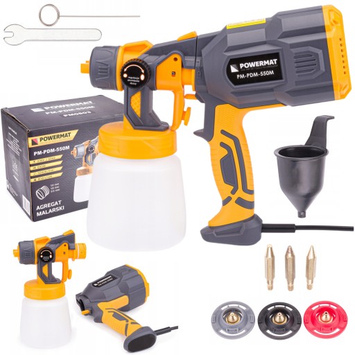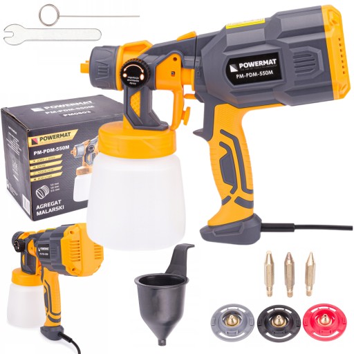 Pistolet do malowania marki POWERMAT został wyposażony w wytrzymały i wydajny silnik o mocy 550 W, jest niezastąpionym narzędziem do użytku domowego.