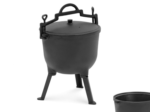 Garnek wykonany został z żeliwa, które jest nie tylko wyjątkowo trwałe ale także dobrze rozprowadza i długo utrzymuje ciepło. Wyposażono go w dopasowaną żeliwną pokrywę oraz 3 nóżki umożliwiające stabilne postawienie garnka w ognisku.