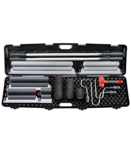 Szpachelki i wałki Parfait Liss Drywaller ClipSystem to specjalnie przygotowany komplet. Całość jest zapakowana w mocną walizkę ułatwiającą przenoszenie oraz ochronę narzędzi przed uszkodzeniem. Zestaw zawiera 5 najbardziej potrzebnych szpachelek, 3 wałki oraz przedłużki teleskopowe.