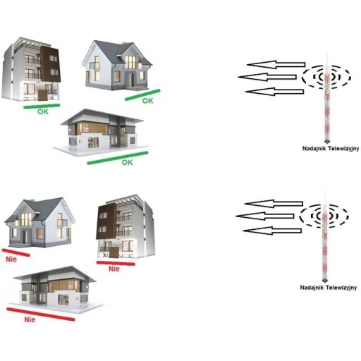 - Antena (każda antena a szczególnie antena pokojowa) musi być skierowana w kierunku nadajnika. Jeżeli nie będzie w oknie/ na ścianie które bezpośrednio wychodzi na nadajnik odbiór telewizji może być nie możliwy.