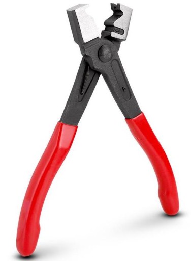 - Szczypce do opasek z obrotowymi szczękami-szczypce pasują do większości rodzajów sprężystych opasek zaciskowych, obrotowe szczęki ponacinane w celu dobrego trzymania dużych i małych zacisków pod dowolnym kątem. Blokada zapadkowa umożliwiająca przytrzymanie szczęk w 5 różnych pozycjach. Blokada pozwala na bezpieczne trzymanie naprężonej opaski .