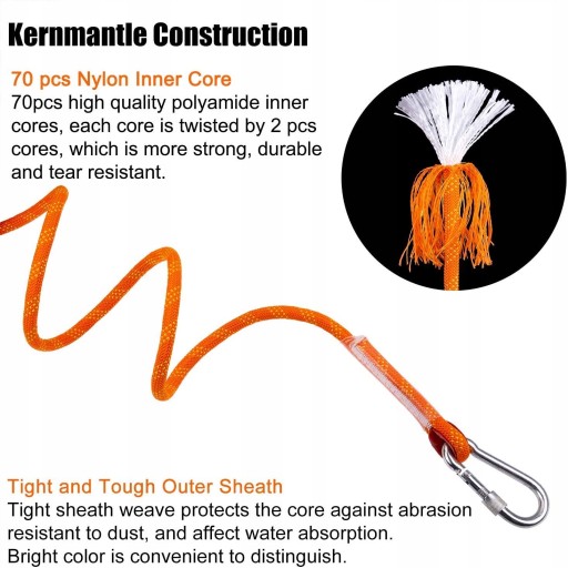 Profesjonalny projekt: na obu końcach naszyte 2 karabińczyki, które nie dają się łatwo złamać po naciśnięciu. Jeśli nie jesteś zadowolony z naszej liny wspinaczkowej, zapewnimy Ci 30-dniowy zwrot pieniędzy.
