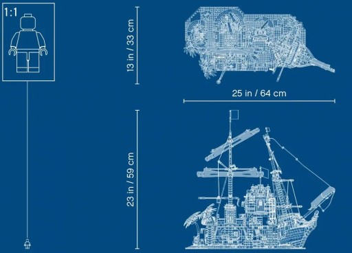- Model ma pomieszczenia z licznymi akcesoriami — kajutę kapitana, kuchnię, tawernę, sypialnię i celę. Wrak można przerobić na statek inspirowany modelem LEGO® Barakuda Czarnych Mórz Kapitana Rudobrodego z 1989 r.
