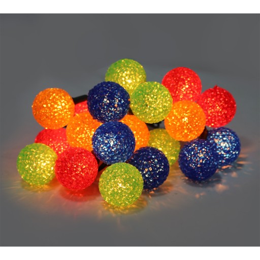 Sznur 20 lampek kolorowych w formie kolorowych kulek. Bardzo przyjemne kolorowe światło. Zasilanie sieciowe. Długość 4,75 metra.