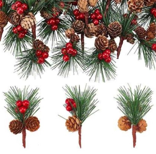 Gałązka sosna z dwoma szyszkami i czerwonymi kulkami, idealna do tworzenia ozdób - stroików na święta lub do zawieszania na choince.