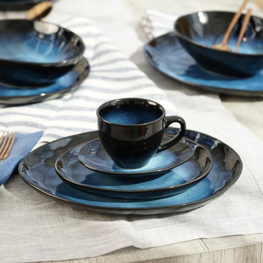 Talerz głęboki w formie miski o wysokości 6 cm i pojemności ok. 600 ml. Linia naczyń kamionkowych Dark Night wyróżnia się ciemną kolorystyką i nieregularnymi kształtami talerzy. Talerze głębokie z zewnątrz są czarne, a wewnątrz pokryte są reaktywnym szkliwem w odcieniach niebieskiego.