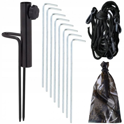 Zawiera szpilki i sznurki do wzmocnienia parasola. Wszystko spakowane w mały pokrowiec. Dodatkowo w komplecie wbijak.
