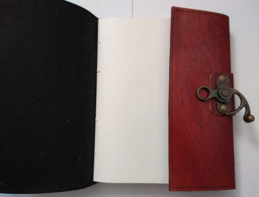 - Naturalnie garbowana, skórzana okładka z ręcznie wycinanymi wzorami i solidnym mosiężnym zamknięciem w kolorze antycznego mosiądzu.