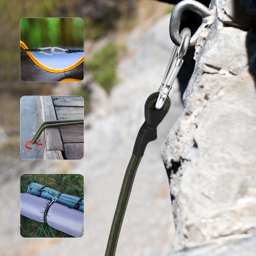 Są to elastyczne sznurki bungee z haczykami, przyjęcie najwyższej jakości i trwałej gumy i materiału ze stopu aluminium. Szeroko stosowane w outdoorze, kempingach, jeździectwach, wspinaczce górskiej itp. Wielofunkcyjne i wszechstronne elastyczne sznurki do użytku domowego i zewnętrznego.