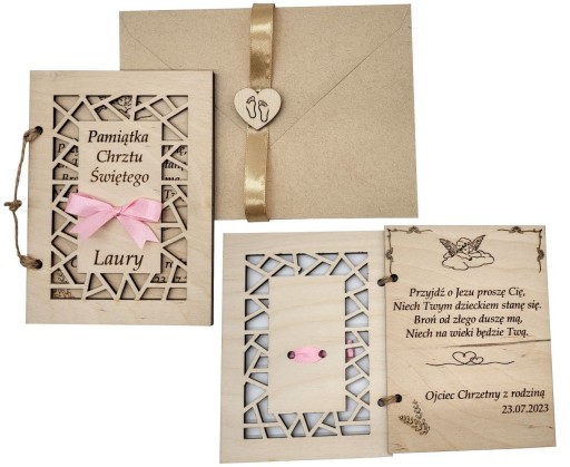 Na zewnątrz jest wygrawerowany napis Pamiątka Chrztu Świętego a poniżej imię dziecka. Karta składa się z dwóch stron, które są związane ze sobą sznurkiem co daje elegancji i tworzy niepowtarzalny klimat.