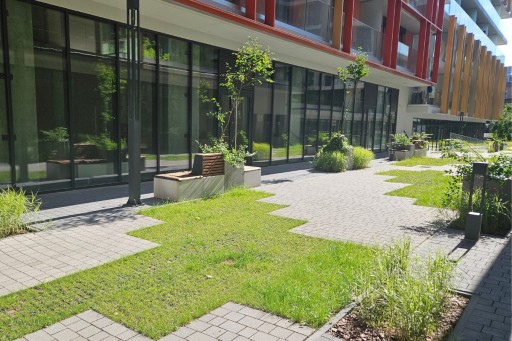 Dzięki dużej powierzchni biologicznie czynnej na poziomie ok. 88%, mamy możliwość tworzenia utwardzonych obszarów bez konieczności ponoszenia kosztów tzw. podatku od kostki brukowej. Z kratek OPL możemy stworzyć zarówno niewidoczne trawiaste ścieżki w naszym ogrodzie, jak i przydomowy parking wypełniony ozdobnym żwirem.
