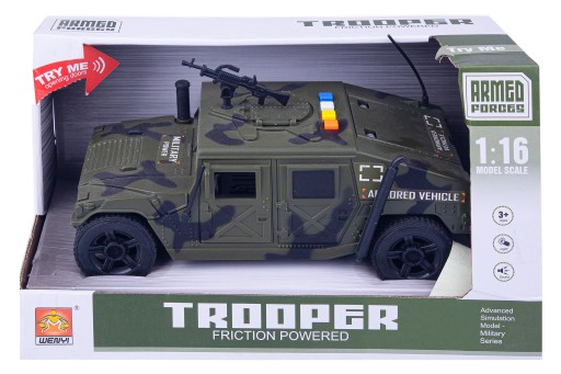 Zabawka to model samochodu wojskowego wyposażonego w karabin umieszczony na dachu oraz napęd. Po przepchnięciu samochód rusza do przodu, kontynuując jazdę autonomicznie. Jest to interaktywna zabawka, która posiada efekty świetlne oraz dźwiękowe. Zasilana jest bateriami (w zestawie), a do jej funkcji należy m.in. obrotowy karabin umożliwiający pełny obrót o 360 stopni. Zastosowano napęd typu "friction" z kołem zamachowym. Rozmiar samochodu to 24.0 x 12.0 x 11.0 cm (bez uwzględnienia karabinu), natomiast opakowanie ma wymiary 29.0 x 13.0 x 18.0 cm. Do działania wymagane są 3 baterie typu AG13/LR44, które są dołączone do zestawu.