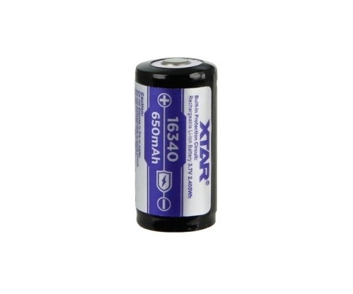 Akumulator XTAR 16340 650mAh z zabezpieczeniem PCM, przed rozładowaniem, przeładowaniem, przeciążeniem i zwarciem. O napięciu 3,7V. Akumulator wykonany w technologi litowo-jonowej. Zapewnia większą gęstość energii. Specjalnie zaprojektowany do latarek.
