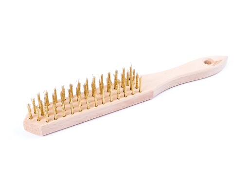 Wysokiej jakości solidna szczotka druciana Polskiej produkcji wykonana z mocnego falowanego drutu mosiężnego zakończona drewnianą rączką.