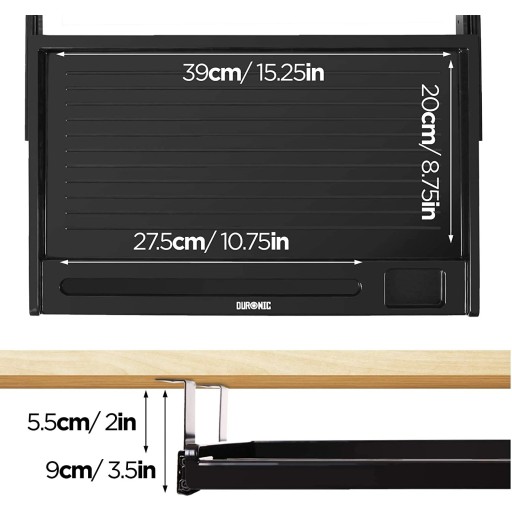 Wygięte ranty zapobiegają wypadaniu rzeczy. Półka nie nadaje się do montażu przy zaokrąglonych krawędziach biurka. Wymiary wewnętrzne szuflady to 20 x 39 cm co zapewnia wystarczająco miejsca na klawiaturę lub inne szpargały, które z jednej strony chcesz mieć w zasięgu ręki, a wolisz nie mieć ich na wierzchu.