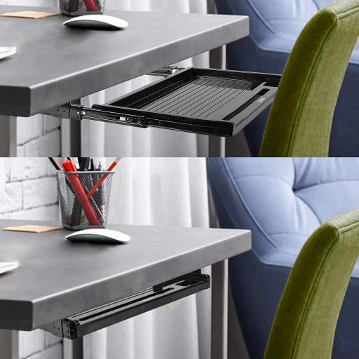 Montaż podstawki jest bardzo prosty. Wystarczy ją przyłożyć do blatu biurka i wkręcić śruby. Udogodnieniem szuflady jest w pełni wysuwana. Rozwiązanie może być niezwykle pomocne dla osób, które w większości wypadków korzystają wyłącznie z dotykowej klawiatury urządzeń mobilnych, a klawiatura jest używana jedynie od czasu do czasu.
