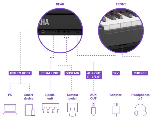 Pianino jest zaopatrzone w szereg gniazd do podłączenia słuchawek, pedałów i komputera.