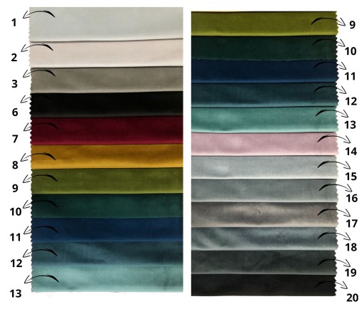 VELLUTO- tkanina typu welur o połyskującej aksamitnej powierzchni. Materiał charakteryzuje się niezwykłą miękkością, pozostawia lekki efekt pisania. Tkanina bardzo wytrzymała i odporna na ścieranie.