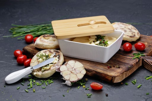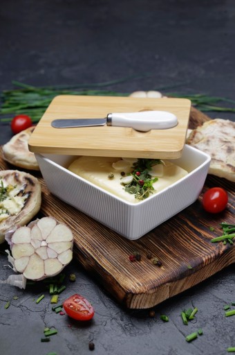 - Maselnica wykonana z wysokiej jakości ceramiki i drewna bambusowego