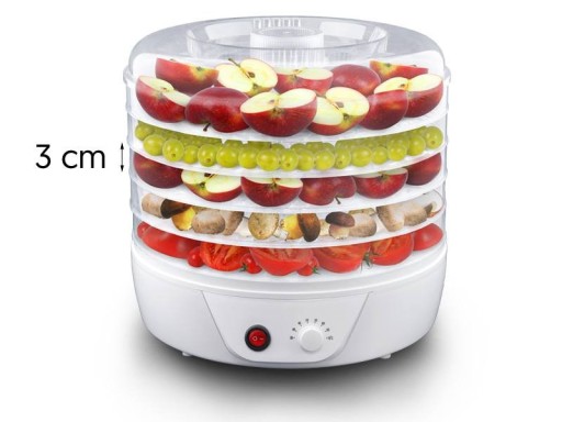 Suszarka spożywcza prezentowana na tej aukcji jest prawdopodobnie największą suszarką na Allegro. Wymiar całego urządzenia to 30 x 32 cm, każda tacka ma 3 centymetry wysokości. Podczas jednego procesu suszenia zmieścisz do niej po prostu więcej.