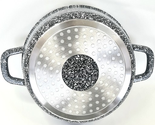 6 elementowe garnki wykonane z odlewanego stopu aluminiowego z anty-przywierającą powłoką z domieszką miału granitowego (imitującą marmur) wykonaną w procesie nanotechnologii tworząc niezwykle gęstą, zwartą oraz gładką warstwę na powierzchni. Powłoka ceramiczna która swoimi właściwościami przewyższa klasyczne powłoki teflonowe.