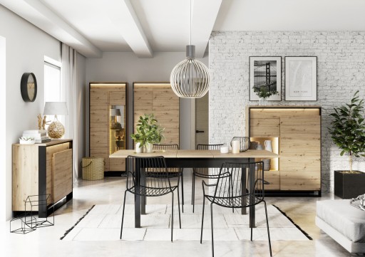 QUANT to propozycja dla wielbicieli nowoczesności i dobrego designu. To meble, które nigdy nie będą tłem, lecz najważniejszym elementem salonowego wystroju. Uwagę zwraca oryginalna, przestrzenna kompozycja frontów oraz drewnopodobny dekor – to znak, że nastąpił powrót do naturalnej kolorystyki. Geometryczne kształty brył zostały zaakcentowane przez czarne ramy, które pełnią również rolę podpór mebli. Gładkie bezuchwytowe fronty sprawiają, że czysta forma nie została zakłócona zbędnym detalem. Całość tworzy wyjątkowe, loftowe w stylu połączenie, które pokochają miłośnicy nowoczesnego designu.