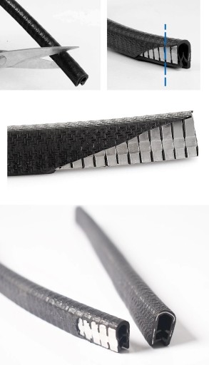 Osłona posiada metalowy rdzeń oblany gumą. Można ją docinać tnąc między segmentami zbrojenia.