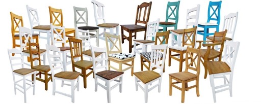 Wszystkie krzesła są wykonane z dobrej jakości drewna Sosnowego. Standardowe wybarwienie krzeseł jest w kolorze wosku Miodowego, natomiast każdy inny kolor można wybrać z gamy kolorów RAL jaką dysponujemy bądź zasugerować własną kolorystykę.