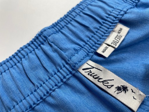 - Spodenki plażowe w niebieskim kolorze. Mają klasyczny prosty krój, krótkie nogawki. Są na gumce, w pasie dodatkowo wiązane. Spodenki są całkowicie gładkie. Posiadają klasyczne kieszenie z przodu oraz jedną dodatkową z tyłu.