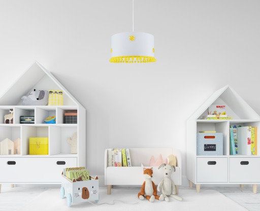 Na dolnej krawędzi abażuru znajdują się pluszowe pompony w odcieniu pastelowego różu, żółci lub szare.