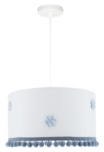 Abażur lampy wykonany jest z subtelnej, białej tkaniny, do której przyczepione są delikatne kwiatki. Te maleńkie, pastelowe kwiatki, rozmieszczone równomiernie na całej powierzchni abażuru, wydają się niemal jak delikatna, wiosenna melodia.