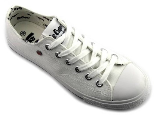 Trampki damskie renomowanej brytyjskiej marki Lee Cooper wykonane zostały z grubej tkaniny w kolorze białym. Podszewka jest materiałowa. Pod wkładką znajduje się miękka pianka, która zapewnia odpowiedni komfort w trakcie chodzenia. Dwa wywietrzniki umożliwiają dopływ powietrza do wnętrza butów. Gumowy nosek zabezpiecza palce i chroni przed przetarciami. Model został osadzony na grubej, gumowej podeszwie. Czarne elementy dodają charakteru białym trampkom.