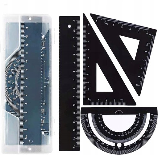 1 * 15 cm linijka, 1 * 30°/60° kwadrat, 1 * 45/° 90 ° linijka kwadratowa i 1 kątomierz.
