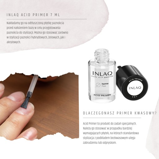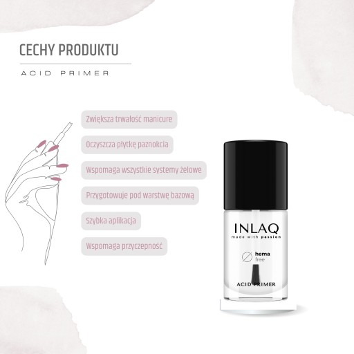 Preparat kwasowy INLAQ, którego zadaniem jest wytrawienie naturalnej płytki i przygotowaniem jej przed zastosowaniem lakierów hybrydowych, żeli oraz akryli.