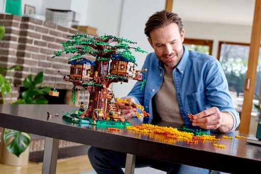 - Ta ciekawa zabawka do zbudowania składająca się z 3036 elementów zawiera podstawę z krajobrazem, drzewo z wymiennymi zestawami zielonych (letnich) oraz żółtych i brązowych (jesiennych) liści, a także Domek na drzewie LEGO® z 3 pomieszczeniami — sypialnią, łazienką i pokojem dziecięcym.