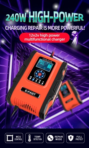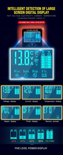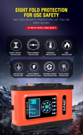• Sterowanie mikroprocesorowe (CPU). • 7-STOPNIOWE AUTOMATYCZNE ŁADOWANIE: • Jest to w pełni automatyczna ładowarka z 7 etapami ładowania. • Automatyczne ładowanie chroni akumulator przed przeładowaniem. Możesz więc zostawić ładowarkę podłączoną do akumulatora na czas nieokreślony. • 7-stopniowe ładowarki są odpowiednie dla większości typów akumulatorów, w tym akumulatorów wapniowych, żelowych AGM, LiFePo4, mokrych, kwasowo-ołowiowych. Mogą również pomóc w regeneracji wyczerpanych i zasiarczonych akumulatorów. • Rodzaje akumulatorów: Większość rodzajów akumulatorów kwasowo-ołowiowych, w tym wapniowych, żelowych AGM, LiFePo4, mokrych, kwasowo-ołowiowych itp.