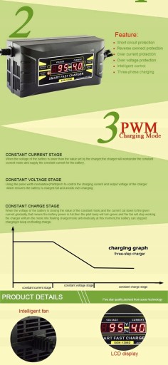 Wykorzystanie technologii modulacji szerokości impulsu (PWM) do kontrolowania prądu ładowania i napięcia wyjściowego ładowarki, co zapewnia pełne naładowanie akumulatora i zapobiega przeładowaniu.