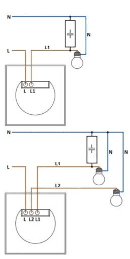 W tym przypadku, podłączasz przewód fazowy z instalacji do gniazda "L" oraz przewódy fazowe żarówek w zależności od ilości przycisków do gniazd "L1", "L2", "L3".