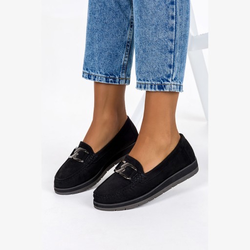 Czarne mokasyny damskie z łańcuchem model D23WX5-B zostały wykonane z wysokogatunkowego zamszu ekologicznego co gwarantuje doskonałą jakość, wygodę i dopasowanie do stopy. Dodatkowo, skórzana wkładka absorbuje wilgoć, odprowadzając ją z powierzchni stopy. Działa to jak naturalny system kontroli wilgoci, utrzymujący stopy suche nawet podczas intensywnego użytkowania butów. Mokasyny z łańcuchem to niezwykle eleganckie obuwie, które stanowi połączenie wygody i luksusu. Te wyjątkowe buty zostały stworzone dla osób, które pragną wyróżnić się i dodać blasku swojemu stylowi. Ich charakterystyczną cechą jest łańcuch umieszczony na cholewce, który dodaje mokasynom niezwykłego uroku i elegancji. Te wyjątkowe buty są idealne zarówno do codziennych, jak i bardziej formalnych okazji. Mogą być noszone z eleganckimi spodniami lub spódnicą, dodając całości szyku. Są doskonałym wyborem dla tych, którze chcą dodać odrobinę ekstrawagancji do swojej casualowej garderoby. Mokasyny z łańcuchem to obuwie, które przyciąga spojrzenia swoim wyjątkowym designem i błyszczącym akcentem. Na Casu znajdziesz wiele wzorów, które z pewnością dodadzą oryginalności Twoim stylizacjom.