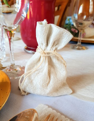 Woreczki materiałowe posłużą nam do pakowania drobnych upominków, prezentów, wykorzystuje się je na wesela: jako podziękowania dla gości (wypełnione słodyczami, migdałami lub innymi drobnymi upominkami). Wykorzystywane są do przechowywania ryżu, grosików, konfetti lub płatków róż, którymi obsypujemy Parę Młodą po wyjściu z kościoła. Woreczki obszyte są piękną delikatną koronką, co daje niesamowity efekt. Zamknięcie woreczka jest bardzo proste, wystarczy pociągnąć jednocześnie za obie tasiemki.