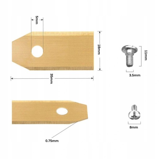 - Wymiary: 35x18mmGrubość: 0.75mmŚrednica otworu centralnego: 5 mm(Producenci Husqvarna™ Gardena™ zalecają wymianę oryginalnych noży na nowe po 3-4 tygodniach pracy).