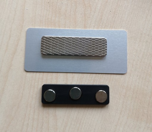 Identyfikator ze stali nierdzewnej o grubości 0,8 mm grawerowany laserem, z zapięciem magnetycznym.