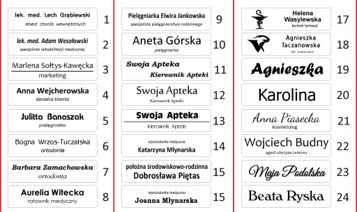 Pomocne w zamawianiu są przykładowe wzory identyfikatorów, grafiki oraz rodzaje czcionek.