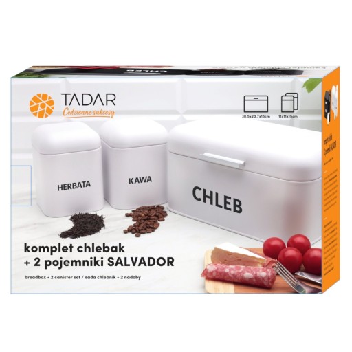 Chlebak Tadar Salvador 30,5 x 20,7 x 15 cm i 2 puszki kuchenne na kawę i herbatę wyglądają bardzo elegancko dzięki malowaniu proszkowemu na biały mat. Ich regularna bryła z czarnymi, polskimi napisami świetnie się prezentuje. Znakomicie dopełni wystrój kuchennych szafek. Nowoczesny chlebak i pojemniki wykonane są z trwałej, odpornej i bezpiecznej dla żywności stali węglowej. Pojemnik na pieczywo ma solidne zawiasy i aluminiowy uchwyt. Będzie zatem służył w twoim domu przez lata. Szczelne zamknięcie zapobiega wysuszeniu pieczywa, a otworki doprowadzające powietrze chronią przed pleśnią. Dzięki temu zachowasz na dłużej świeżość chleba i bułek. Puszki ochronią natomiast kawę i herbatę przed wilgocią i zwietrzeniem.