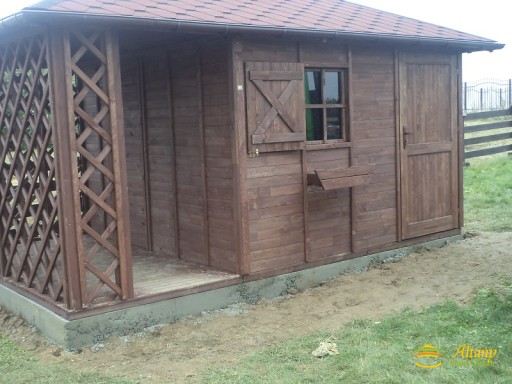 Ściany części o rozmiarze 3x3m odeskowane są metodą na pióro i wpust . Część zabudowana służy do przechowywania narzędzi, część ażurowa o wymiarach 1,5x3m służąca jako skład na drewno. Konstrukcja domku umożliwia samodzielne ocieplenie od wewnątrz domku.