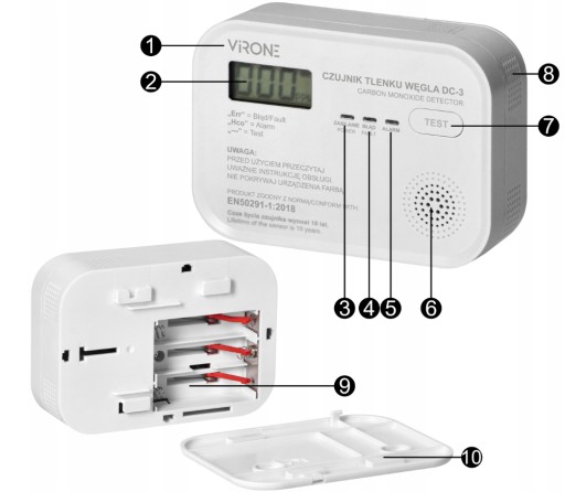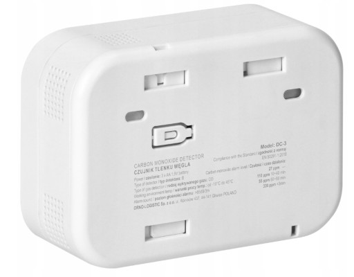 - jest zgodny z rygorystyczną normą EN 50291-1:2018 dla domowych detektorów tlenku węgla.
