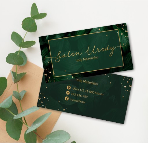 Piękne wizytówki dwustronne w kolorze butelkowej zieleni.