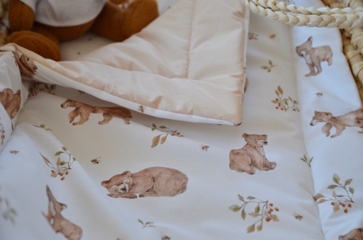 W tym wzorze na innych naszych aukcjach dostępny jest również otulacz bambusowy w większym rozmiarze jak również pościel bawełniana z wypełnieniem w dwóch rozmiarach i prześcieradło do gondoli, kosza lub dostawki.